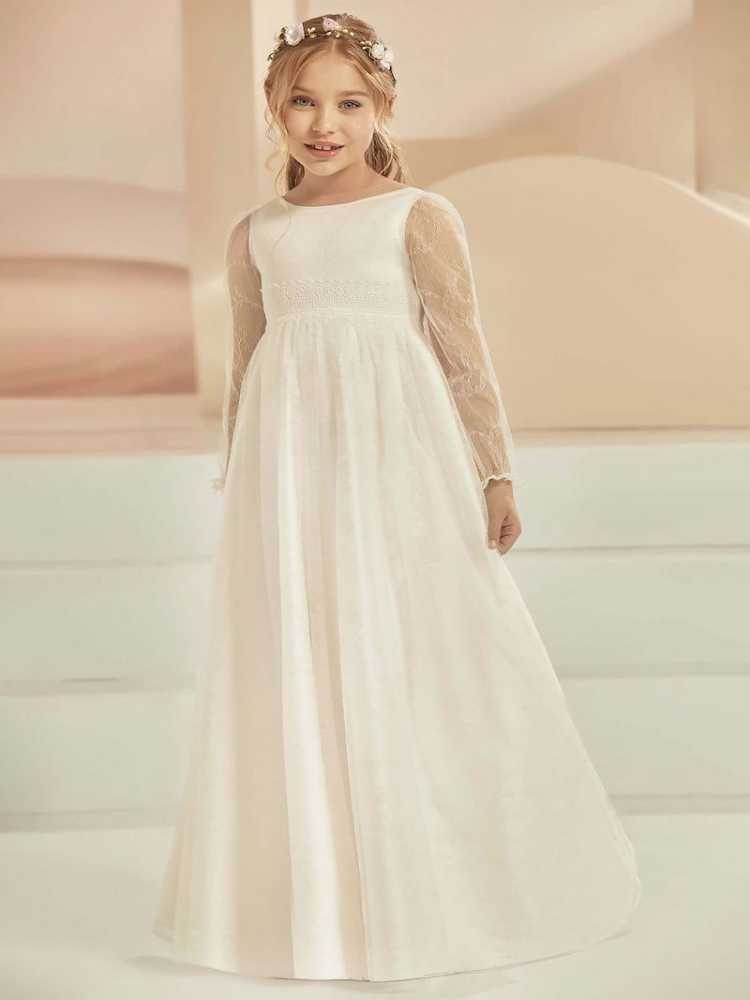 Si tratta di un bellissimo abito da comunione in pizzo con splendidi dettagli. L'abito ha uno scollo rotondo e maniche trasparenti.
