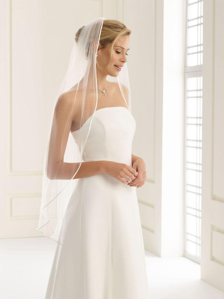 Bellissimo velo Bianco Evento a strato singolo con bordi in raso e pettine per un facile fissaggio ai capelli.