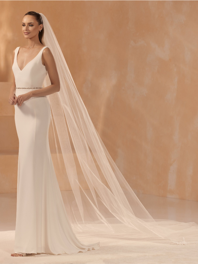 Questo elegante velo di Bianco Evento completerà il vostro look da sposa. Questo velo a strato singolo è realizzato in tulle a rombi con un bordo tagliato in alto e un bordo in pizzo in basso. Viene fornito con un pettine per facilitare il posizionamento del velo tra i capelli. La lunghezza del velo è di 350 cm.