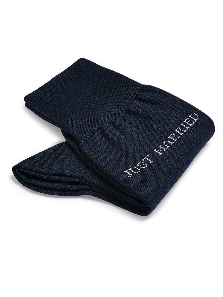 Questi calzini Just Married di colore blu scuro sono progettati specialmente per il futuro sposo.