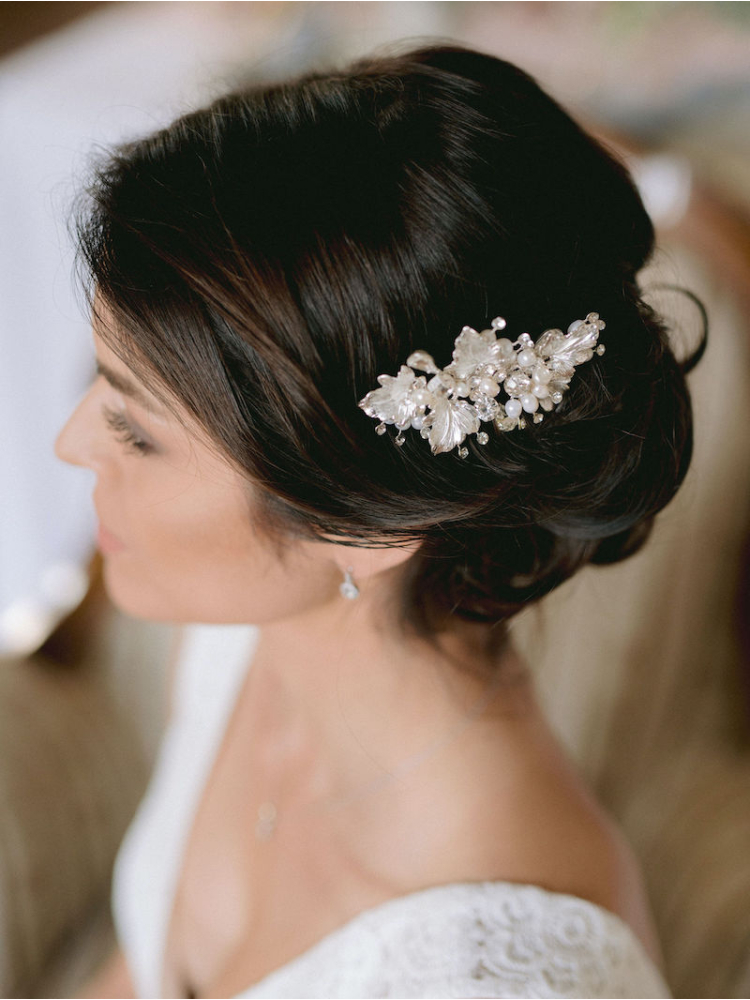 Pregevole pettine da sposa argentato di G. Westerleigh, realizzato a mano e decorato con splendidi brillantini, foglie argentate e perline in imitazione avorio.