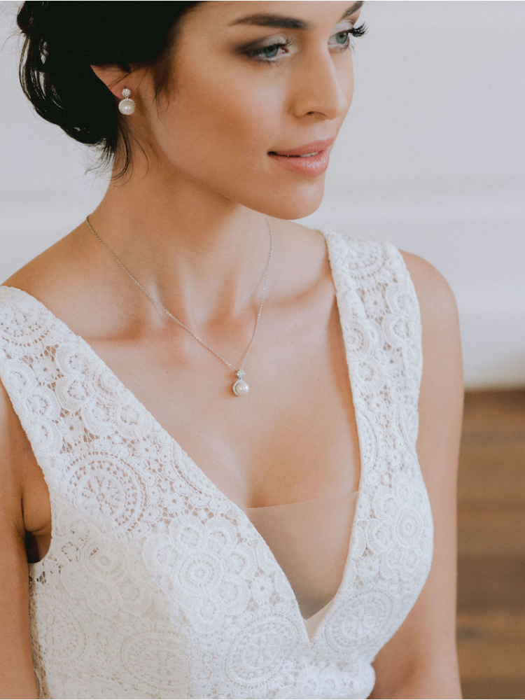 Sta cercando gioielli che si abbinino sia al tuo vestito da sposa sia al tuo partner? Allora dai un'occhiata ai nostri set di gioielli. Scegliere un set di gioielli ti farà risparmiare tempo nella ricerca di gioielli coordinati e potrai essere sicura che i tuoi gioielli si abbinino tra loro. Il set di gioielli DZ0147 è composto da orecchini e collana ed è molto elegante. La semplicità di questo set lo rende adatto a qualsiasi vestito da sposa.