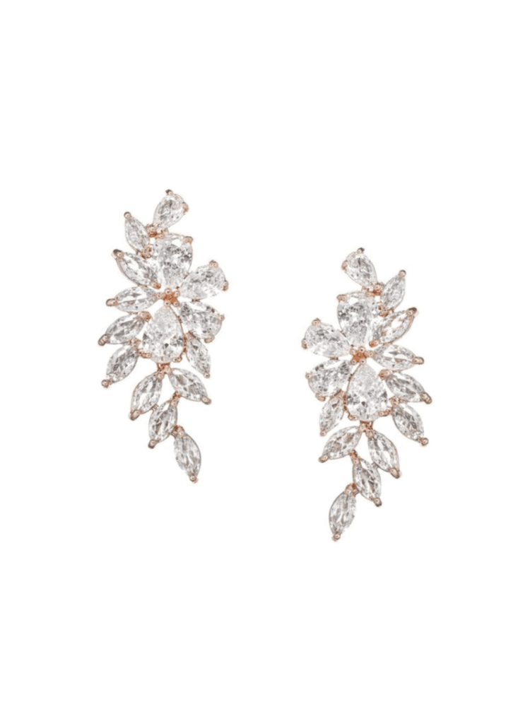 Questi preziosi orecchini in oro rosa sono composti da un'imponente disposizione di brillanti pietre di zirconia cubica. Gli orecchini placcati in oro rosa brilleranno nel tuo giorno speciale e daranno il tocco finale al tuo abito da sposa. Gli orecchini hanno una lunghezza di 3,5 cm. Questi orecchini sono disponibili anche in argento.