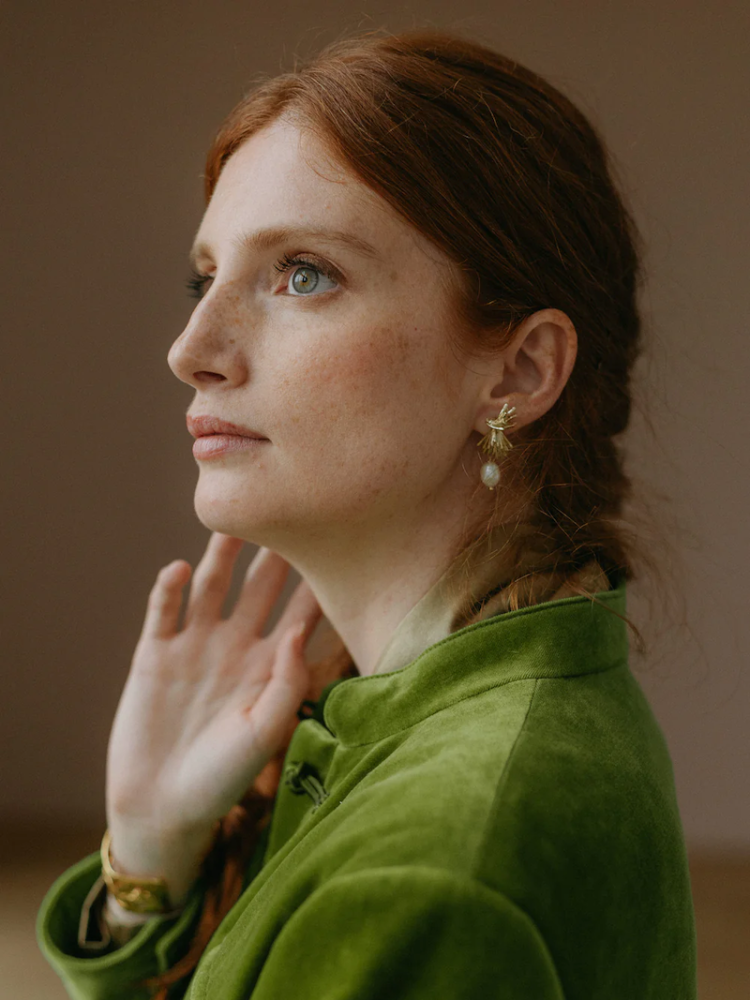 Sono realizzati a partire da una spilla vintage trovata in un mercato delle pulci a Lorient, in Francia, e trasformati in un pezzo unico di gioielleria. Il design presenta perle di acqua dolce genuine, aggiungendo un tocco di bellezza naturale. Ogni paio è realizzato a mano a Parigi e dorato in oro fine, il che conferisce loro una finitura calda e radiosa.