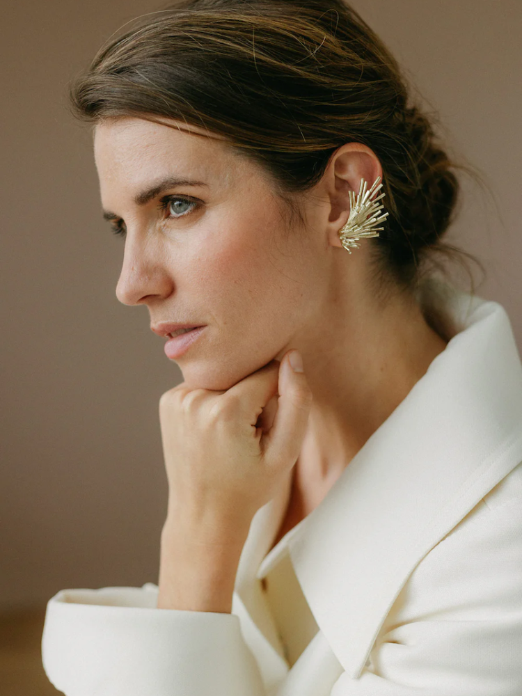 Gli orecchini Iris di Lizeron uniscono il fascino vintage all'eleganza. Ispirati a una spille d'epoca, si curvano lungo l'orecchio con un design in oro e un gancio in argento per un comfort maggiore. Realizzati a mano e unici, conferiscono un tocco sofisticato a qualsiasi look.