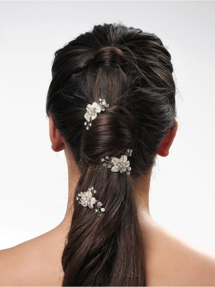 Queste 3 forcine decorative sono decorate con perle e strass color avorio. Le forcine possono essere utilizzate in vari modi in diverse acconciature durante il vostro matrimonio, sia per i capelli sciolti che per quelli raccolti e intrecciati.