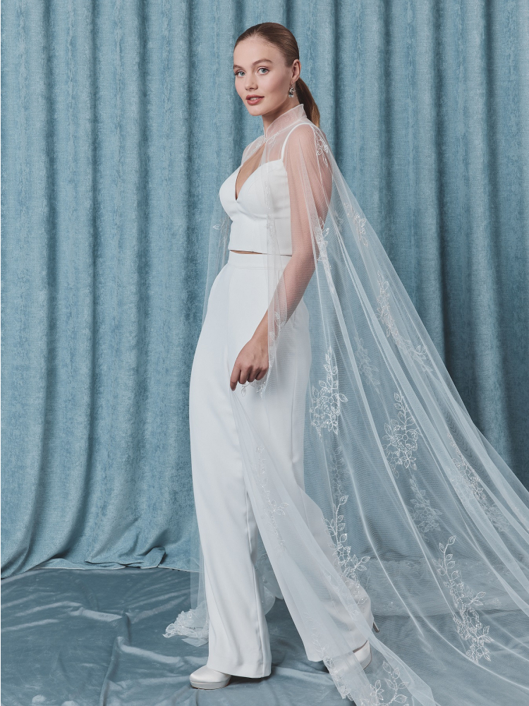 Il colletto alla coreana incornicia il décolleté con una struttura sottile e si chiude davanti con un raffinato bottone in cristallo, garantendo sia eleganza che comodità. Il Poirier C-75107 Mantello è il tocco finale perfetto per le spose che cercano una sofisticatezza senza tempo con un tocco moderno e ispirato alla haute couture. Ideale per cerimonie o ritratti nuziali, questo mantello trasforma qualsiasi abito o outfit in un look davvero indimenticabile.