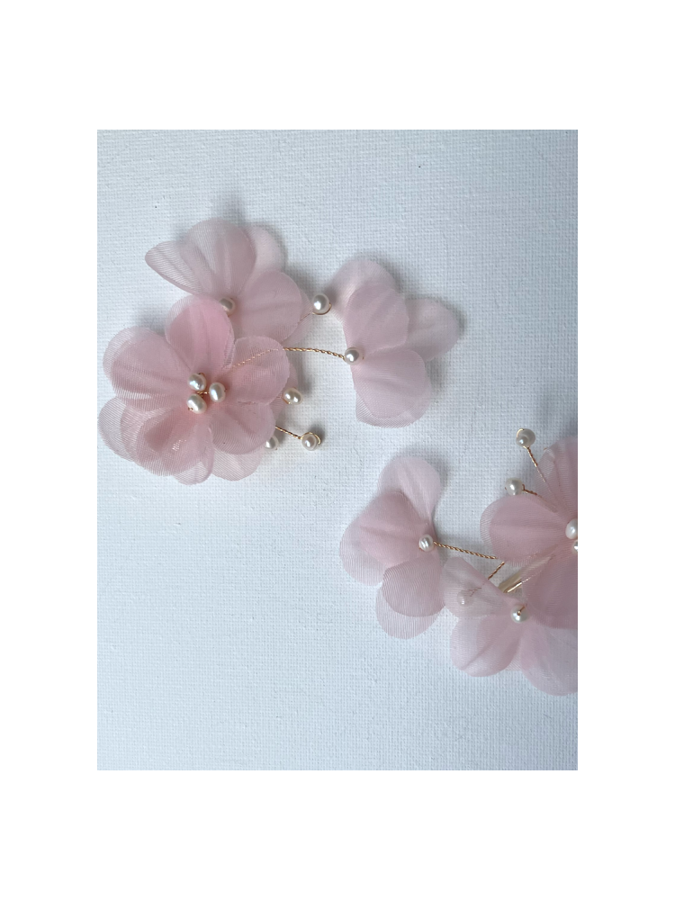 Forcine dorate con fiori in tessuto e perle d'acqua dolce. Un tocco romantico ed elegante per acconciature da sposa o damigelle.